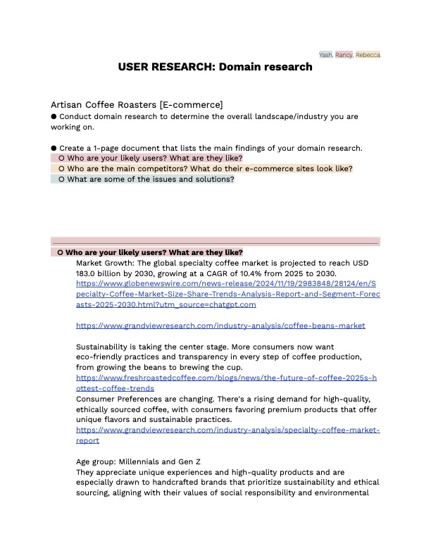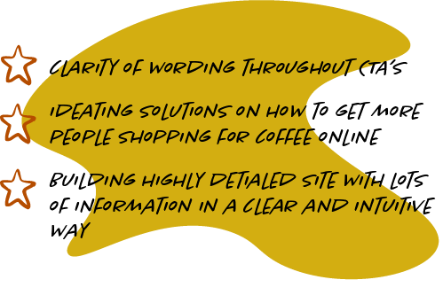 For this project, myself and my team were assigned to build a coffee roasting brand. The project focused around bringing more customers into online shopping in a category that struggles to fullfill that- namely, coffee.