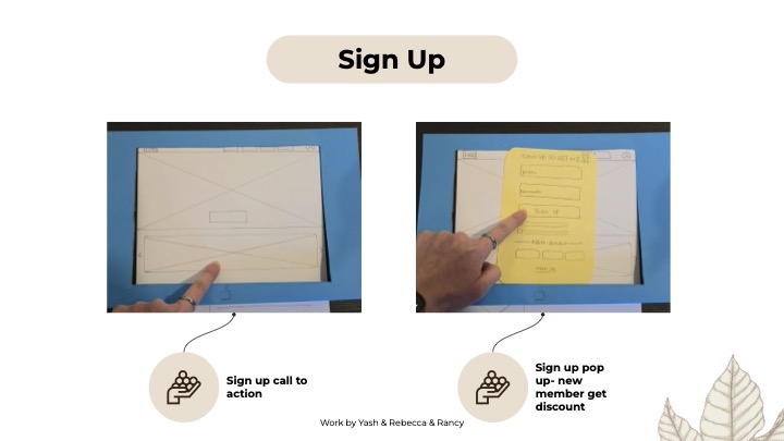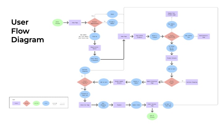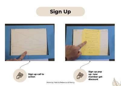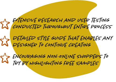 Our entire process took us from research- domain, competitor, and survey research to create an affinity diagram and narrow down our main features as well as create our ideal user persona. We then moved on to maping out our site by creating user flow diagrams and site maps, as well as building out our branding and style guide. Following that we built paper prototypes and conducted user testing before building out our final website which focused on our one main feature of recieving a free sample with your first purchase upon becoming a member.